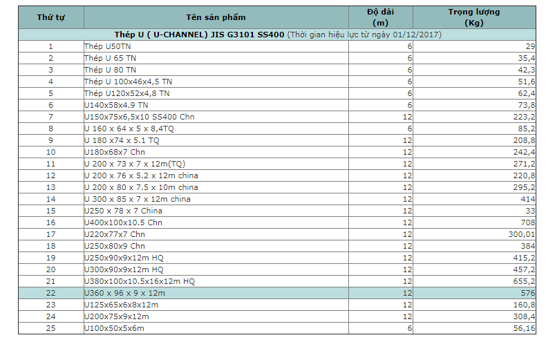 | STT | Tên sản phấm | Độ dài (m) | Trọng lượng (KG) |