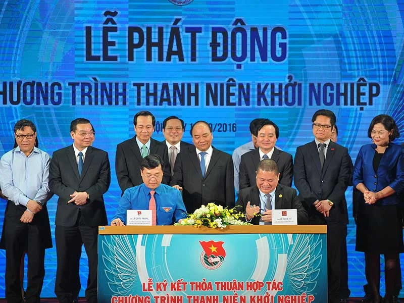 Thủ tướng Nguyễn Xuân Phúc chứng kiến lễ ký kết hợp tác giữa Trung ương Đoàn với đại diện các doanh nghiệp đồng hành cùng chương trình “Thanh niên khởi nghiệp”. Ảnh: V.THỊNH