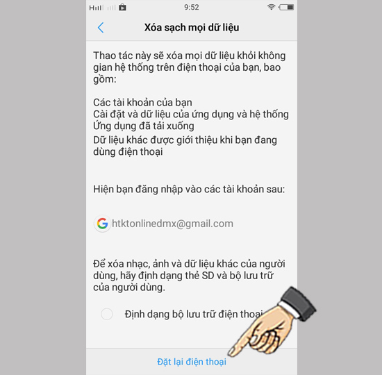 Lưu ý: Tất cả dữ liệu trên điện thoại của bạn sẽ bị xóa đi và không thể phục hồi lại được.