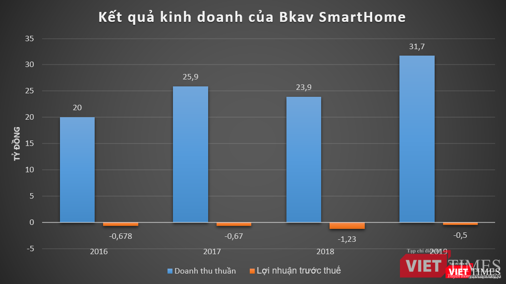 Tuy nhiên, dữ liệu của VietTimes cho thấy, trong 4 năm trở lại đây, Bkav SmartHome liên tục báo lỗ. Như năm 2016 và 2017, doanh thu thuần của Bkav SmartHome lần lượt đạt 20 tỷ đồng và 25,9 tỷ đồng; lỗ trước thuế lần lượt ở mức 678 triệu đồng và 670 triệu đồng.