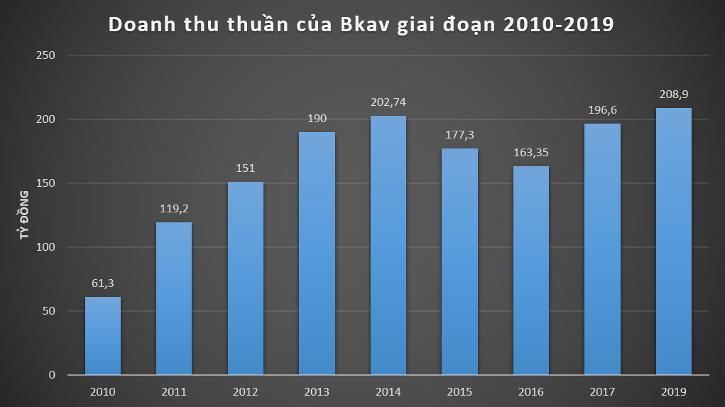 Dữ liệu của VietTimes cho thấy, trong giai đoạn từ năm 2010-2014, doanh thu thuần của Bkav liên tục tăng trưởng, từ 61,3 tỷ đồng năm 2010 lên 202,74 tỷ đồng năm 2014, cùng đó là khoản lợi nhuận trước thuế đạt vài tỷ cho đến vài chục tỷ đồng mỗi năm.