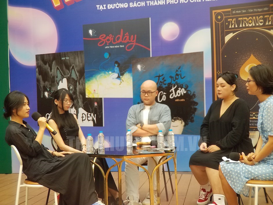 Các khách mời giao lưu chia sẻ tại chương trình(Thanhuytphcm.vn) - Sáng 17/4, tại Đường Sách TPHCM diễn ra buổi giao lưu, giới thiệu bộ sách “Vượt qua trở ngại tâm lý” gồm 2 tác phẩm “Ta trong ta” và “Biến cô đơn thành sức mạnh” do Nhà xuất bản Kim Đồng phát hành.