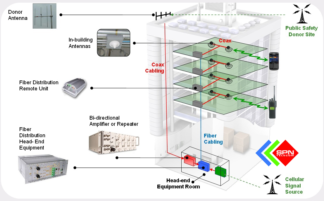 Ví dụ: Hệ thống kích sóng điện thoại dùng DAS, IBS triển khai cho các tòa nhà chung cư cao tầng, hầm gửi xe, thang máy được mô tả như hình bên dưới, để tăng tín hiệu sóng điện thoại di động cho các nhà mạng như Viettel, Vinaphone, Mobifone,...