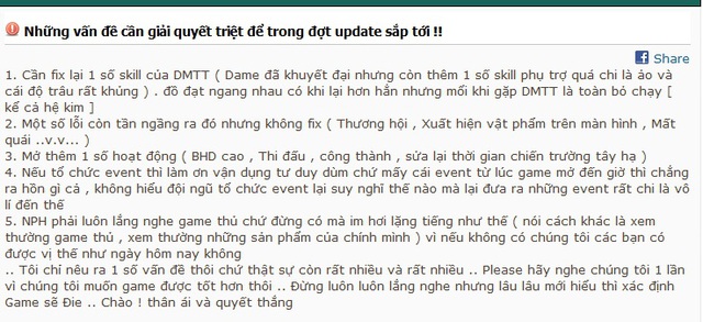 1. Cần fix lại 1 số skill của DMTT (Dam đã khuyết đại nhưng còn thêm 1 số skill phụ trợ quá chi là ảo và cái độ trâu rất khủng), đồ đạc ngang nhau có khi lại hơn hẳn nhưng mổi khi gặp DMTT là toàn bỏ chạy.