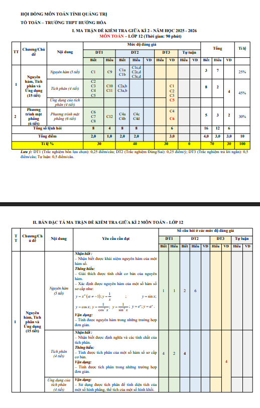 Đề cương giữa kì 2 Toán 12 năm 2025 – 2026 trường THPT Hướng Hóa – Quảng Trị 25/02/2026