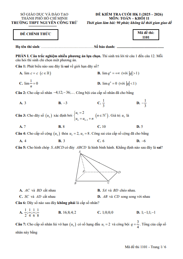 Đề cuối kỳ 1 Toán 11 năm 2025 – 2026 trường THPT Nguyễn Công Trứ – TP HCM 08/01/2026