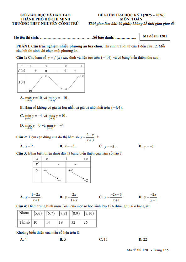 Đề cuối kỳ 1 Toán 12 năm 2025 – 2026 trường THPT Nguyễn Công Trứ – TP HCM 08/01/2026