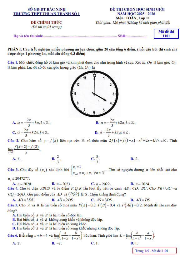 Đề thi chọn HSG Toán 11 năm 2025 – 2026 trường THPT Thuận Thành 1 – Bắc Ninh 18/03/2026
