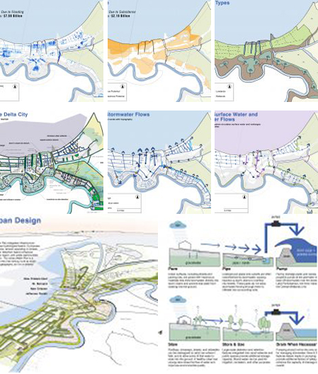 Để minh họa cho các vấn đề nêu trên, có thể lấy một ví dụ về một dự án KTCQ ven sông với tên gọi là “ Living with water “ , (Dự án: Sống với nước . Địa điểm: New Orleans, LA Công ty: Waggonner & Ball , Năm: 2008-2010; bên cạnh dòng sông Mississippi, với quan điểm thay đổi mạnh mẽ từ dự kiến ban đầu sử dụng giải pháp công nghệ và kỹ thuật để khống chế, đối phó với nước, ngập lụt, sang giải pháp coi nước là một tài nguyên tự nhiên cần bảo vệ. Đây được coi là một giải pháp quan trọng của KTCQ nhằm thích ứng với sự biến đổi khí hậu của địa phương. Các nhà quy hoạch Hà Lan và Mỹ và các nhà thiết kế đô thị, kiến trúc sư , kỹ sư, và các chuyên gia về đất và thủy văn cũng như các cơ quan và trường đại học đã có nhiều cuộc hội thảo để đi đến những quyết định cụ thể. Các nghiên cứu không chỉ khám phá tiềm năng chuyển đổi sử dụng đất bằng cách tập trung ưu tiên vào nước – chủ yếu là nước mưa, nước mặt và nước ngầm, mà còn mang đến một tầm nhìn mới để quản lý các tài nguyên nước đồng thời giải quyết lũ lụt phù sa, sụt lún và lạm dụng tài nguyên nước trong khu vực. Dự án phác thảo ra các nguyên tắc để quản lý nước, quy hoạch vùng và thiết kế đô thị, qua đó hình thành quy trình xem xét các loại thổ nhưỡng địa phương, nước và đa dạng sinh học; mạng lưới cơ sở hạ tầng hiện có; Năm nguyên tắc cốt lõi của Sống với nước là: Làm chậm và lưu trữ nước mưa; Lưu thông và nạp lại nước mặt và nước ngầm; Xây dựng với thiên nhiên; Thiết kế thích ứng với biến đổi khí hậu.