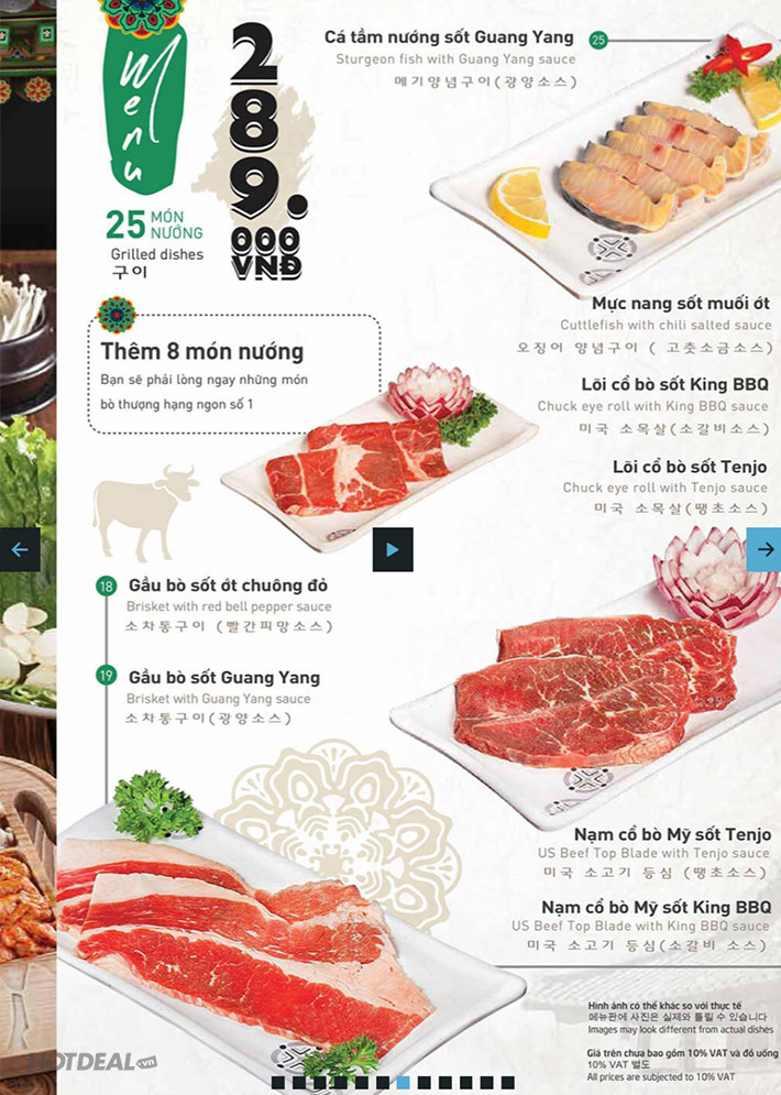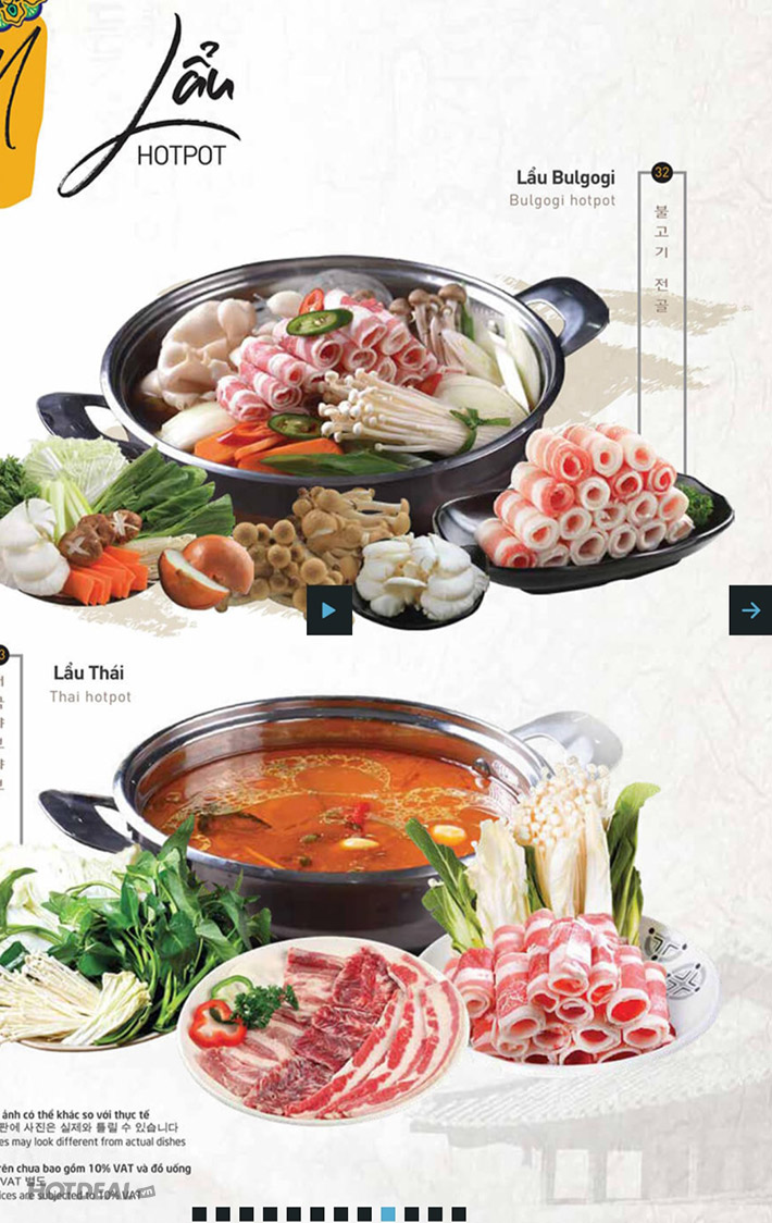 Lẩu chuẩn vị với Lẩu Bò Bulgogi & nấm, Lẩu kim chi, Lẩu Thái chua cay… nhúng kèm thêm ba chỉ bò, rau, nấm kim chi theo mùa. Và cùng rất nhiều món ăn kèm đúng điệu hương vị Hàn như: Canh sườn bò hàn quốc, Canh rong biển Hàn Quốc, Canh kimchi, Cơm trộn Hàn Quốc...