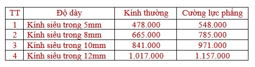 BẢNG GIÁ KÍNH SIÊU TRONG