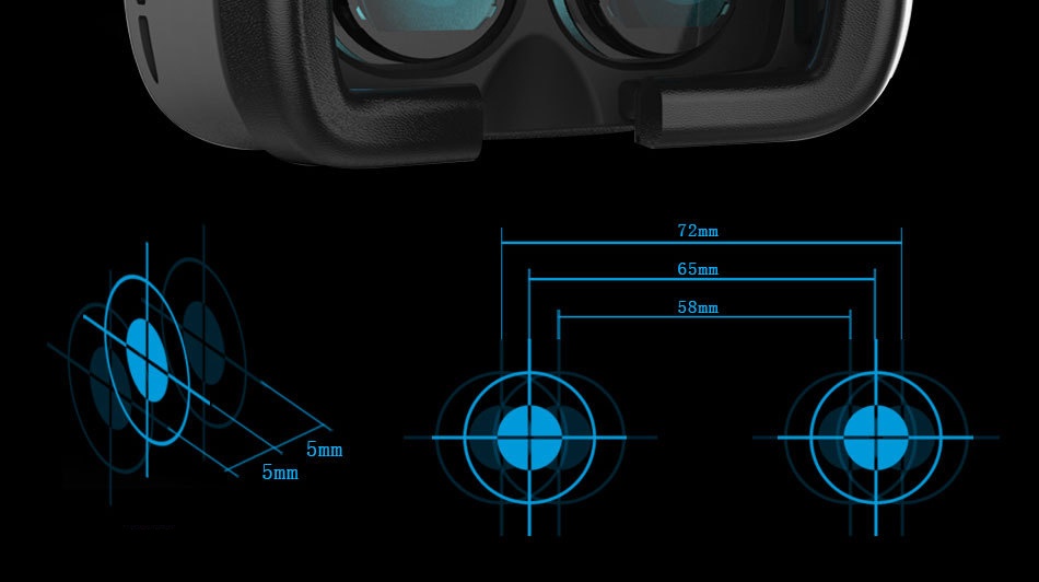 Cơ chế điều chỉnh tiêu cự cho khoảng cách xử lý lên tới 72mm chiều ngang và 10mm chiều sâu, tương thích với mọi khuôn mặt người lớn, trẻ em và mọi loại mắt dù cận thị hay viễn thị mà không cần phải đeo thêm bất kì phụ kiện nào nữa. Tròng kính pha lê lớn lên tới 42mm cho góc nhìn rộng, kết hợp với cơ chế chỉnh tiêu cự bằng nút gạt cho khoảng cách chỉnh tiêu cự theo chiều ngang rất lớn. Với những tính năng như vậy, VR BOX II cho phép người xem có thể thưởng thức những bộ phim với góc nhìn lên đến 310 độ như thưởng thức phim như ngoài rạp IMAX một cách rất chuyên nghiệp.