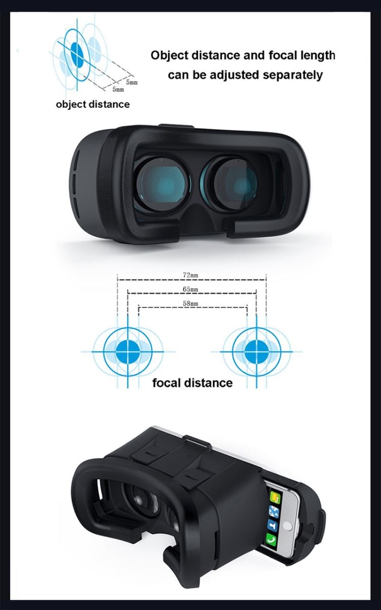 Kính thực tế ảo VR Box làm bằng ABS và ống kính nhựa mà không kích thích tấm nhựa vì thế rất thân thiện với môi trường, thiết kế phù hợp. Khoảng cách giữa điện thoại và ống kính được thiết kế có thể điều chỉnh phù hợp với những người có tầm nhìn khác nhau ( người cận thị, viễn thị) và có thể dễ dàng điều khiển bằng cần gạt.