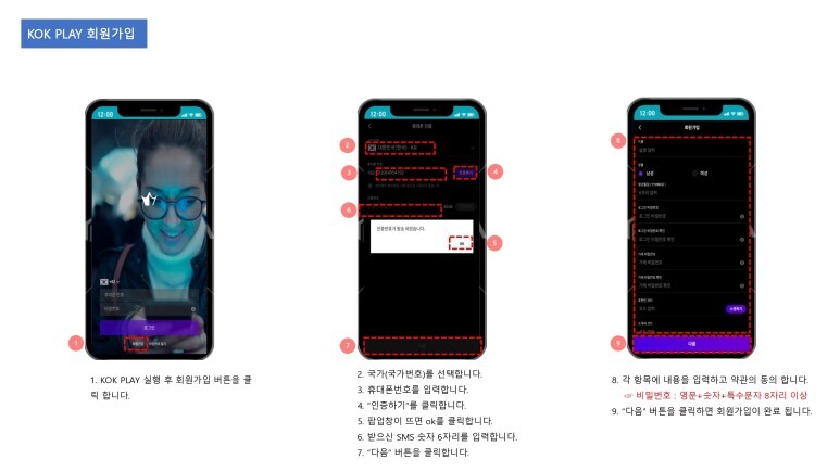 KOK PLAY 실행 후 하단의 회원가입 클릭, 국적을 선택하고 핸드폰 번호를 입력.