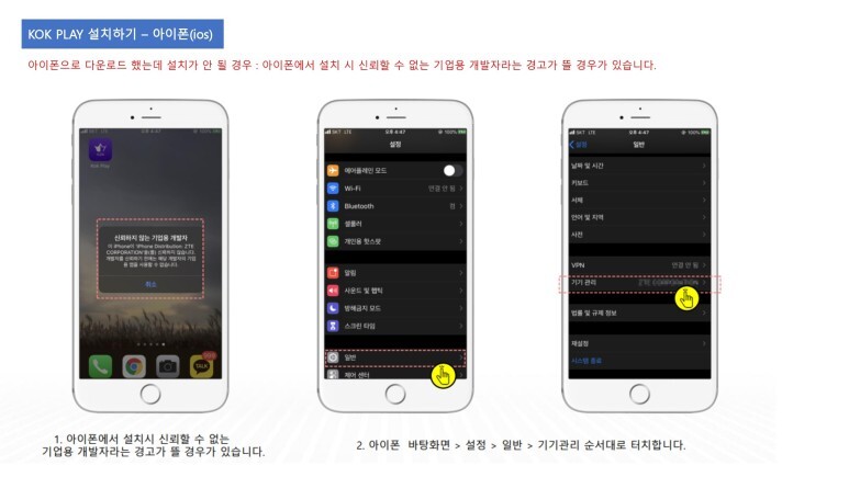 설정(☼) → 일반 → 기기관리 → 기업용 앱 → 생성된 타이틀 클릭 → 신뢰를 클릭하여 ios에서 KOK PLAY를 실행할 수 있도록 설정하자.