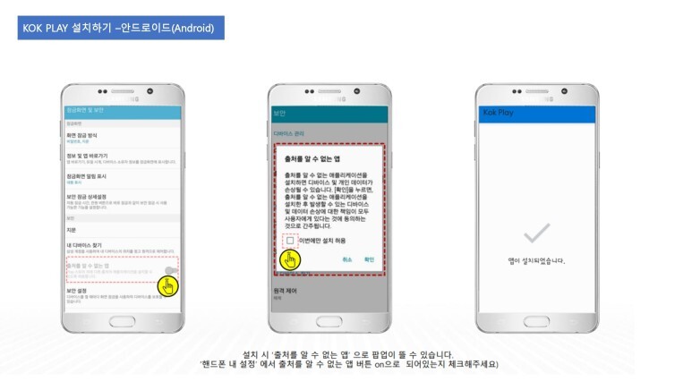 KOK PLAY 설치 시' 출처를 알수 없는 앱'으로 팝업이 뜰 수 있으니