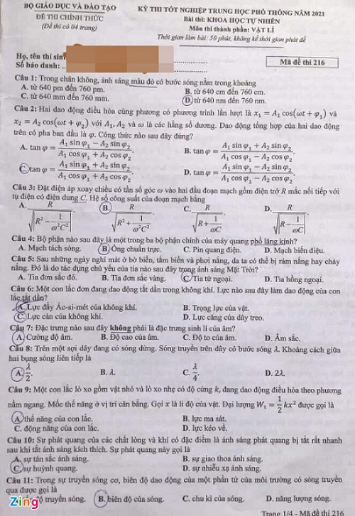 > Đáp án chính thức môn Vật lý - kỳ thi tốt nghiệp THPT 2021 > Nhấn F5 để cập nhật thông tin