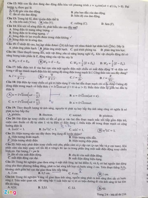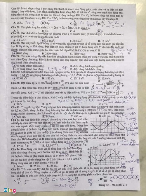 > Đề thi môn Vật lý - kỳ thi tốt nghiệp THPT 2021 đợt 1 Mã đề 216