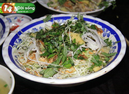 Quán rất đôngRau bắp cải thái chỉ mỏng dính, miếng thịt gà xé nhỏ, da giòn tan, thêm ít hành khô, lạc rang và rau thơm, trộn đều lên, thích ăn cay thì bo vào vài lát ớt, chua cay mặn ngọt nếm cho vừa miệng. Ăn mãi không thấy chán. Nhiều người khi lần đầu tiên đến ăn, nhìn thấy một bát tướng rau bắp cải sống thì tỏ ra e ngại, sợ nồng sợ ngái khó ăn. Nhưng trộn đều lên thì tuyệt nhiên không có một chút mùi vị nào của bắp cải sống. Ăn giòn và mát.