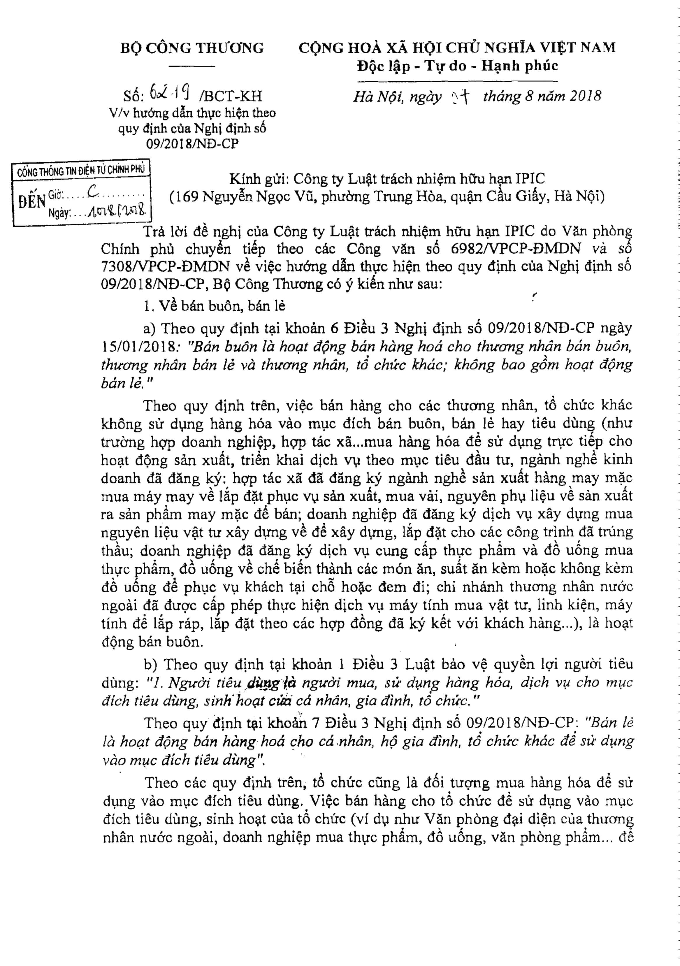 Trước tiên, Công ty Luật TNHH IPIC gửi lời chào Trân trọng đến Quý cơ quan! Công ty Luật TNHH IPIC (Sau đây gọi tắt là "IPIC") trong quá trình tư vấn cho doanh nghiệp có vốn đầu tư nước ngoài hoạt động mua bán hàng hóa và các hoạt động liên quan đến mua bán hàng hóa, IPIC và các nhà đầu tư gặp phải vướng mắc liên quan đến việc phân biệt khái niệm bán buôn và khái niệm bán lẻ theo quy định của Nghị định 09/2018/NĐ-CP cụ thể như sau:
