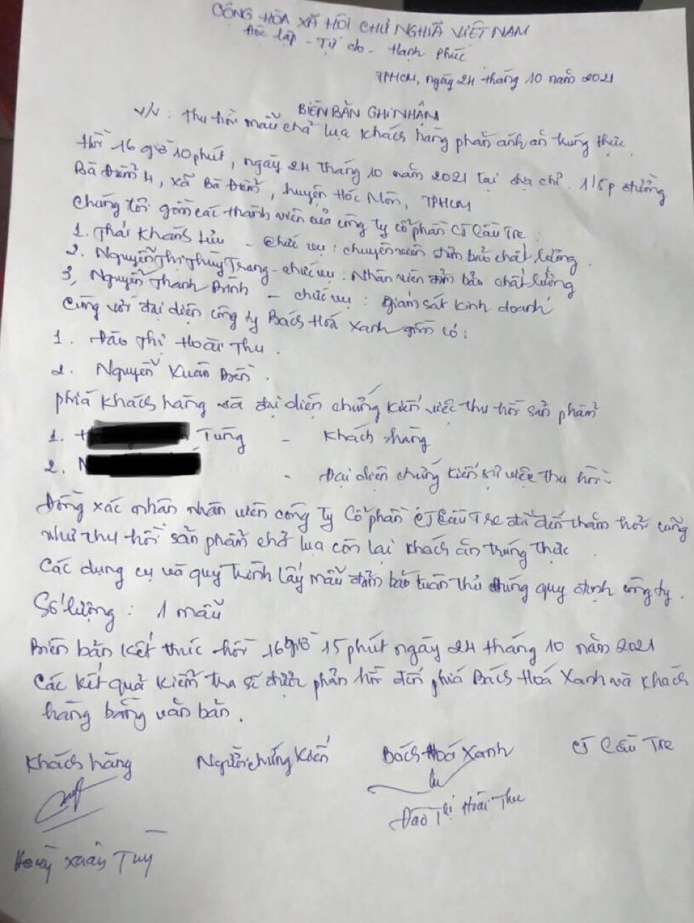 Sau đó, anh T. đã liên hệ đến cửa hàng Bách Hóa Xanh để phản ánh vụ việc. Đến khoảng 16h cùng ngày, đại diện cửa hàng Bách Hóa Xanh và Công ty CJ Cầu Tre đã đến gặp gia đình anh T. để hỏi thăm sức khỏe, đồng thời, xin thu hồi phần chả lụa còn lại để đưa về kiểm tra.