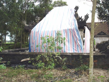 | Miếu Kè bị cháy đang được nhân dân che tạm. |