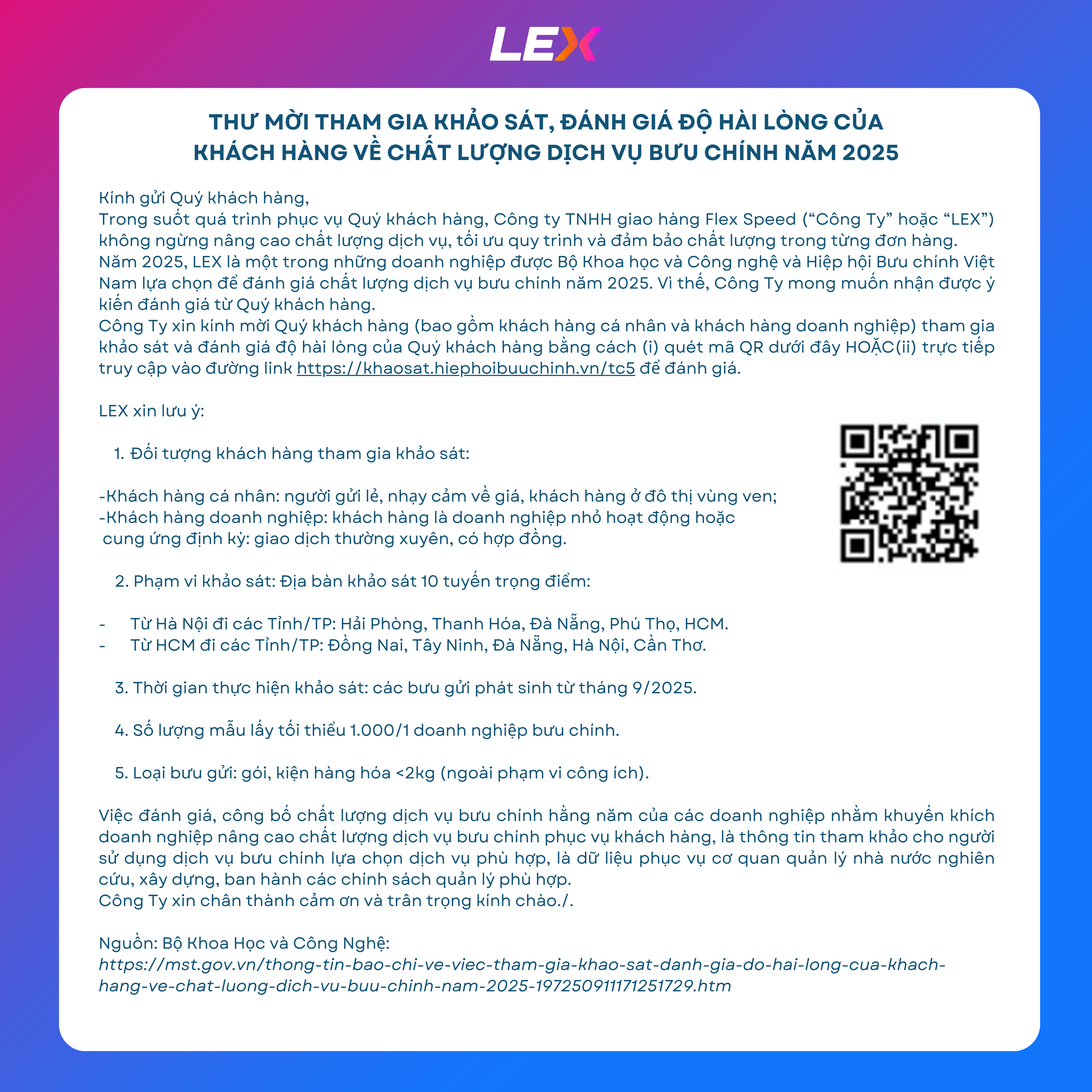 Kính gửi Quý đối tác, LEX VN là đơn vị cung cấp giải pháp logistics hàng đầu trong lĩnh vực thương mại điện tử tại Việt Nam. Chúng tôi luôn chú trọng nâng cao chất lượng dịch vụ và mở rộng mạng lưới để hợp tác cùng các đối tác tiềm năng. Nhận thấy Quý đối tác là nhà cung cấp uy tín trong ngành chuyển phát nhanh tại địa phương, chúng tôi mong muốn hợp tác để cùng phát triển và gia tăng giá trị tại các khu vực: Hà Nội, Huế, Đà Nẵng, Phan Thiết, Đồng Nai, Bình Dương và các tỉnh thành tiềm năng khác. Quý đối tác vui lòng liên hệ LEX bằng cách quét QR hoặc nhấn vào Hãy bắt đầu để chúng ta cùng mở ra cơ hội hợp tác mới trên hành trình phát triển ngành logistics. Trân trọng.