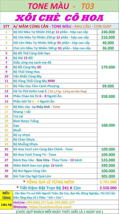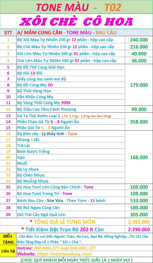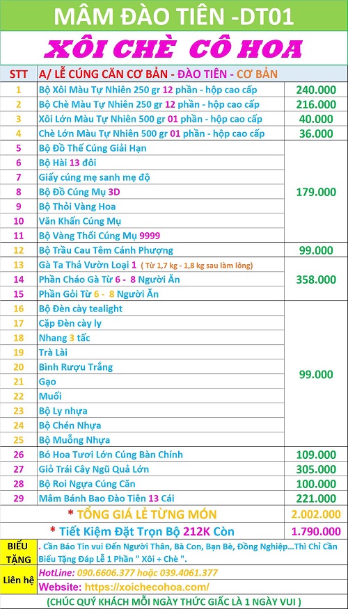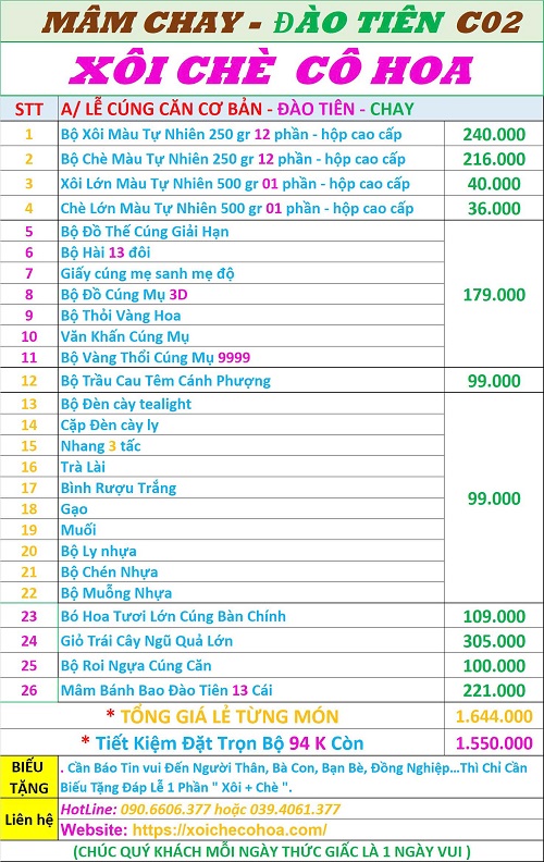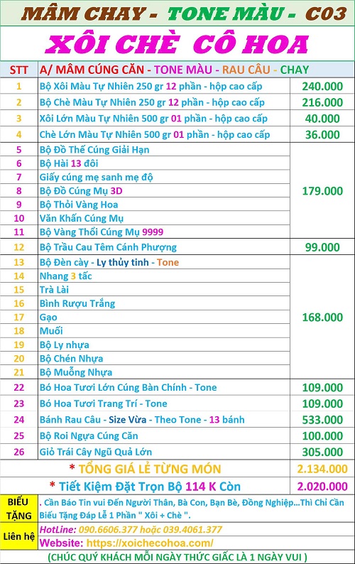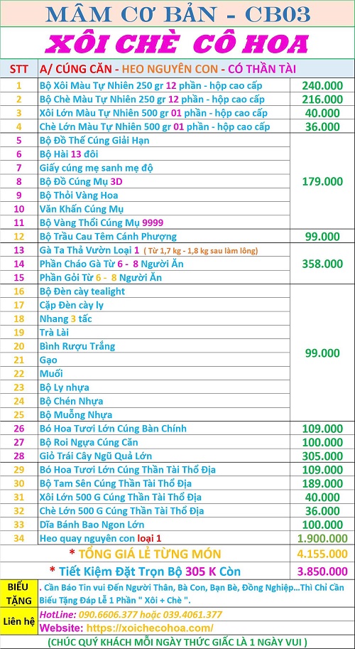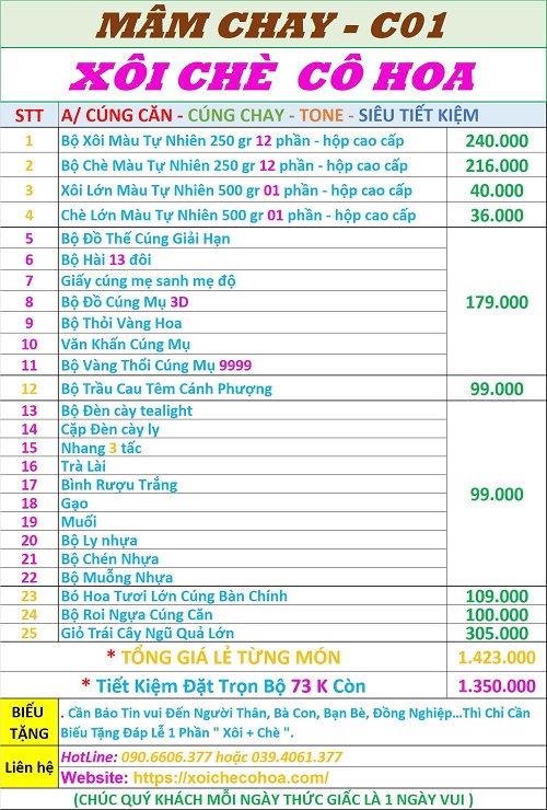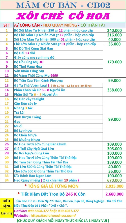 Bảng giá bộ lễ cúng căn đơn gian khách thường đặt nhất