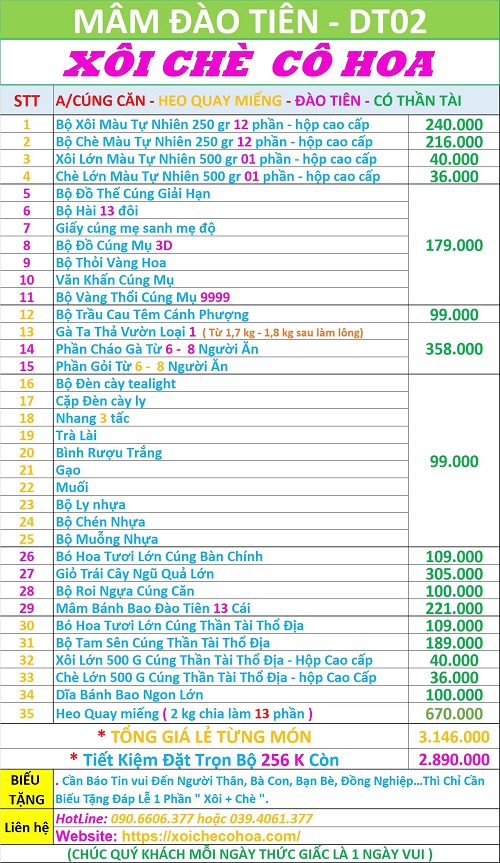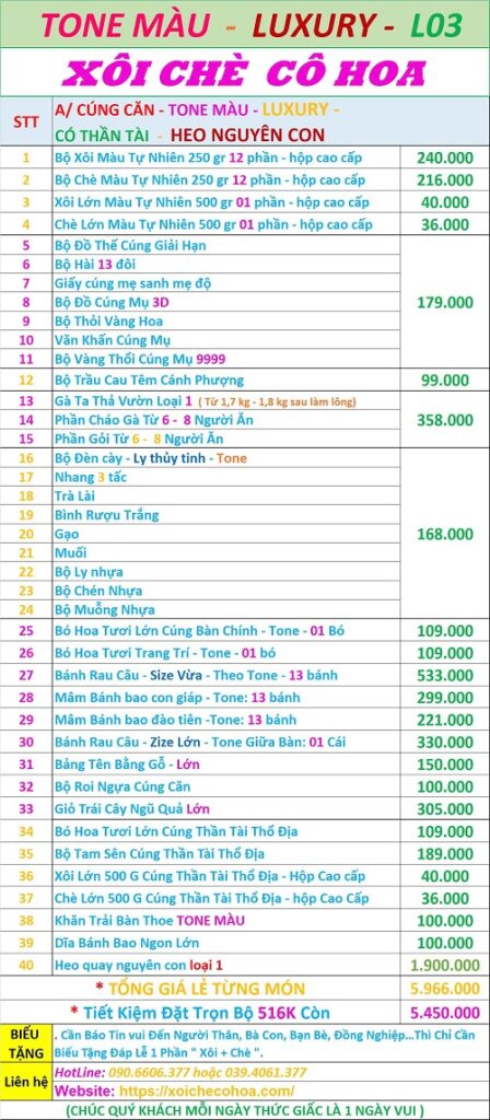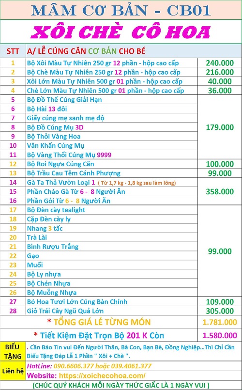 – Do những lê vật cúng căn cho bé trai 3 tuổi là những lễ vật không máy xa trong cuộc sống hằng ngày, những lễ vật này mỗi cha mẹ cháu bé có thể đã có vài món nên sẽ có nhu cầu chỉ cần mua bổ sung những vật lễ chưa có. Vì thế để đáp ứng nhu cầu của quý khách cửa hàng cô Hoa chè có cúng cấp giá bán chi tiết từng món để cho khách hàng lựa chọn phù hợp:
