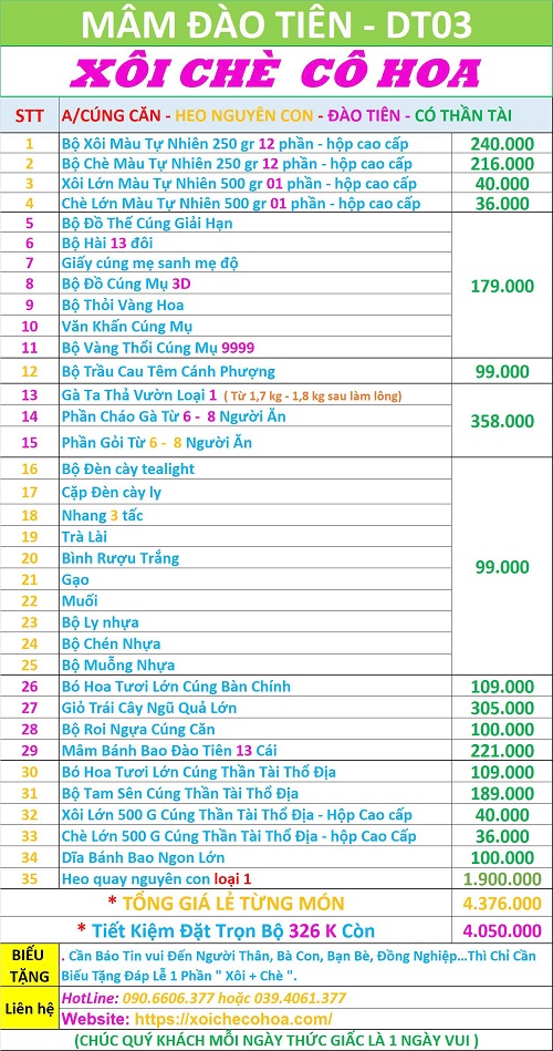 | XEM BÁO GIÁ CÁC DỊCH VỤ CÚNG KHÁC TẠI XOICHECOHOA.COM | ||