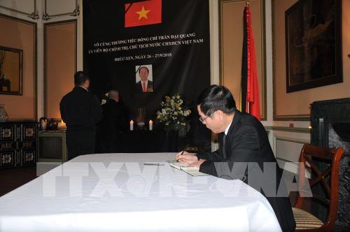 Cũng trong ngày 26/9, Đại sứ quán Việt Nam tại Vương quốc Bỉ đã đón đại điện của Bộ ngoại giao Bỉ, Cơ quan đối ngoại châu Âu, Đại sứ quán các nước Algeria, Sudan, Lào, Campuchia, Australia, Philippines …. cùng đông đảo bạn bè quốc tế tại Brussels tới viếng và ghi sổ tang Chủ tịch nước Trần Đại Quang. /.