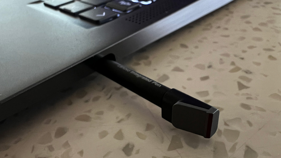 The right side provides a second USB-A 3.2 Gen 1 port (again with always-on), a combo headphone/microphone jack, and, if configured at purchase time, a nano-SIM card slot. There’s also a Kensington lock slot and a garage for the bundled Lenovo Integrated Pen.