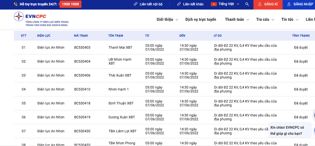 01Điện lực An NhơnBC530403Thanh Mai XBT05:00 ngày 07/06/202214:30 ngày 07/06/2022Di dời ĐZ 22 KV, 0,4 KV theo yêu cầu của địa phươngĐã duyệt02Điện lực An NhơnBC530404UB Nhơn Hạnh XBT05:00 ngày 07/06/202214:30 ngày 07/06/2022Di dời ĐZ 22 KV, 0,4 KV theo yêu cầu của địa phươngĐã duyệt03Điện lực An NhơnBC530406Thái Xuân XBT05:00 ngày 07/06/202214:30 ngày 07/06/2022Di dời ĐZ 22 KV, 0,4 KV theo yêu cầu của địa phươngĐã duyệt04Điện lực An NhơnBC530410Nhơn Hạnh 105:00 ngày 07/06/202214:30 ngày 07/06/2022Di dời ĐZ 22 KV, 0,4 KV theo yêu cầu của địa phươngĐã duyệt05Điện lực An NhơnBC530418Định Thuận XBT05:00 ngày 07/06/202214:30 ngày 07/06/2022Di dời ĐZ 22 KV, 0,4 KV theo yêu cầu của địa phươngĐã duyệt06Điện lực An NhơnBC530419Dương Xuân XBT05:00 ngày 07/06/202214:30 ngày 07/06/2022Di dời ĐZ 22 KV, 0,4 KV theo yêu cầu của địa phươngĐã duyệt07Điện lực An NhơnBC530430TBA Liêm Lợi XBT05:00 ngày 07/06/202214:30 ngày 07/06/2022Di dời ĐZ 22 KV, 0,4 KV theo yêu cầu của địa phươngĐã duyệt08Điện lực An NhơnBC530433TBA Nhơn Phong 1 XBT05:00 ngày 07/06/202214:30 ngày 07/06/2022Di dời ĐZ 22 KV, 0,4 KV theo yêu cầu của địa phươngĐã duyệt09Điện lực An NhơnBC530442TBA KDC Liêm Định05:00 ngày 07/06/202214:30 ngày 07/06/2022Di dời ĐZ 22 KV, 0,4 KV theo yêu cầu của địa phươngĐã duyệt10Điện Lực Quy NhơnAC530445Đinh Bộ Lĩnh05:30 ngày 07/06/202217:30 ngày 07/06/2022Thay xà, sứ đứngĐã duyệt11Điện Lực Quy NhơnAC530455Lê Thánh Tôn 105:30 ngày 07/06/202217:30 ngày 07/06/2022Thay xà, sứ đứngĐã duyệt12Điện Lực Quy NhơnAC530458Trần Bình Trọng05:30 ngày 07/06/202217:30 ngày 07/06/2022Thay xà, sứ đứngĐã duyệt13Điện Lực Quy NhơnAC530672Phan Bội Châu 305:30 ngày 07/06/202217:30 ngày 07/06/2022Thay xà, sứ đứngĐã duyệt14Điện Lực Quy NhơnAH539135TBA Nhà thờ lớn05:30 ngày 07/06/202217:30 ngày 07/06/2022Thay xà, sứ đứngĐã duyệt15Điện Lực Quy NhơnAH539140TBA BV ĐK Thành Phố05:30 ngày 07/06/202217:30 ngày 07/06/2022Thay xà, sứ đứngĐã duyệt16Điện Lực Quy NhơnAH539141TBA Trường CĐ Y Tế Bình Định05:30 ngày 07/06/202217:30 ngày 07/06/2022Thay xà, sứ đứngĐã duyệt17Điện Lực Quy NhơnAH539148TBA BV Đa Khoa Thành Phố 205:30 ngày 07/06/202217:30 ngày 07/06/2022Thay xà, sứ đứngĐã duyệt18Điện Lực Phú PhongDC538021TBA Tây An06:30 ngày 07/06/202214:00 ngày 07/06/2022- Tháo lèo ĐZ22kV bằng phương pháp hotline - Thay sứ treo và dây dẫn tại ĐZ22kV bằng phương pháp hotline ; - Đấu lèo ĐZ22kV bằng phương pháp hotlineĐã duyệt19Điện Lực Phú PhongDC538023TBA T106:30 ngày 07/06/202214:00 ngày 07/06/2022- Tháo lèo ĐZ22kV bằng phương pháp hotline - Thay sứ treo và dây dẫn tại ĐZ22kV bằng phương pháp hotline ; - Đấu lèo ĐZ22kV bằng phương pháp hotlineĐã duyệt20Điện Lực Phú PhongDC538024TBA T206:30 ngày 07/06/202214:00 ngày 07/06/2022- Tháo lèo ĐZ22kV bằng phương pháp hotline - Thay sứ treo và dây dẫn tại ĐZ22kV bằng phương pháp hotline ; - Đấu lèo ĐZ22kV bằng phương pháp hotlineĐã duyệt21Điện Lực Phú PhongDC538025TBA T306:30 ngày 07/06/202214:00 ngày 07/06/2022- Tháo lèo ĐZ22kV bằng phương pháp hotline - Thay sứ treo và dây dẫn tại ĐZ22kV bằng phương pháp hotline ; - Đấu lèo ĐZ22kV bằng phương pháp hotlineĐã duyệt22Điện Lực Phú PhongDC538030Trạm Bơm Đại chí (dân dụng)06:30 ngày 07/06/202214:00 ngày 07/06/2022- Tháo lèo ĐZ22kV bằng phương pháp hotline - Thay sứ treo và dây dẫn tại ĐZ22kV bằng phương pháp hotline ; - Đấu lèo ĐZ22kV bằng phương pháp hotlineĐã duyệt23Điện Lực Phú PhongDC538044TBA Trà Sơn06:30 ngày 07/06/202214:00 ngày 07/06/2022- Tháo lèo ĐZ22kV bằng phương pháp hotline - Thay sứ treo và dây dẫn tại ĐZ22kV bằng phương pháp hotline ; - Đấu lèo ĐZ22kV bằng phương pháp hotlineĐã duyệt24Điện Lực Bồng SơnCC533167TBA Thành Sơn07:15 ngày 07/06/202208:15 ngày 07/06/2022Điều chỉnh nấc phân áp phía 22kV TBA 250kVA Thành SơnĐã duyệt25Điện lực Phù MỹEH539151Đông á07:15 ngày 07/06/202208:45 ngày 07/06/2022Thay TI định kỳĐã duyệt26Điện lực Phù MỹEC538052VĂN TRƯỜNG07:30 ngày 07/06/202209:00 ngày 07/06/2022Đấu nối sang tải, cập nhật lộ trình TBAĐã duyệt27Điện Lực Phù CátGC530622TBA Chánh Lý07:50 ngày 07/06/202210:10 ngày 07/06/2022Kiểm tra bảo dưỡng kết hợp thay nấc phân áp nứtĐã duyệt28Điện Lực Bồng SơnCH539153TBA Công ty Cổ Phần Năng Lượng Hà Tiên08:00 ngày 07/06/202217:00 ngày 08/06/2022KH đề nghị cắt điện để đấu nối ĐZ 0,4kV vào TBA IDEMITSU1250kVAĐã duyệt29Điện lực Phù MỹEH539159TBA Xí nghiệp 38009:00 ngày 07/06/202210:30 ngày 07/06/2022Thay TI định kỳĐã duyệt30Điện Lực Phú TàiFH539072ABC09:00 ngày 07/06/202211:30 ngày 07/06/2022Thao lèo ĐZ 22kV XT473/QNHĐã duyệt31Điện Lực Phù CátGC530629TBA Chánh Nhơn 210:20 ngày 07/06/202212:40 ngày 07/06/2022Kiểm tra báo dưỡng kết hợp thay mặt kính chỉ thị dầu nứtĐã duyệt32Điện Lực Phù CátGC530614TBA Mỹ Thuận13:20 ngày 07/06/202214:40 ngày 07/06/2022Kiểm tra báo dưỡng kết hợp CBM cấp độ 2Đã duyệt33Điện lực Phù MỹEH539135Lê Minh Công14:45 ngày 07/06/202216:15 ngày 07/06/2022Thay TI định kỳĐã duyệt34Điện Lực Phù CátGC530859Đại Hào 214:50 ngày 07/06/202216:10 ngày 07/06/2022Kiểm tra báo dưỡng kết hợp CBM cấp độ 2Đã duyệ