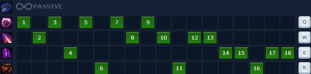 Kỹ năng Cạm Bẫy Nghệ Thuật (E) tăng sau cùng. Chiêu cuối (R) Sân Khấu Tử Thần tăng đúng cấp độ.