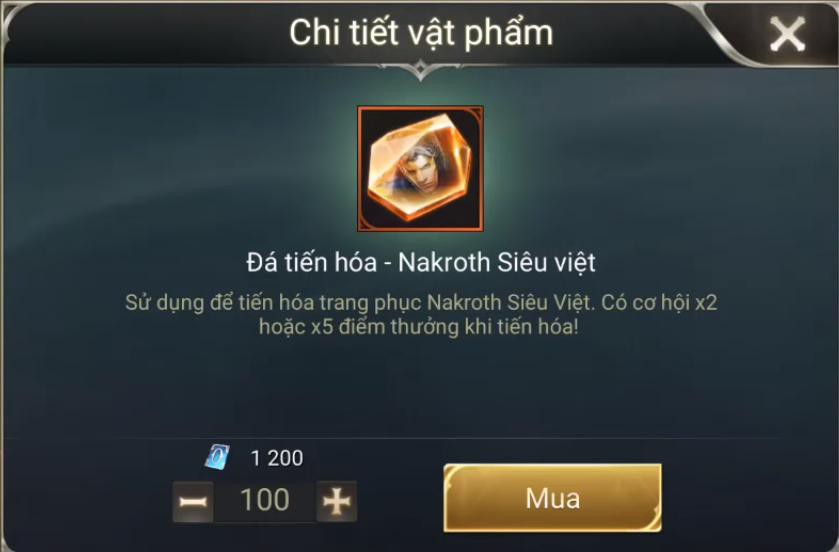Tất nhiên, bạn phải đáp ứng yêu cầu cơ bản là sở hữu tướng Nakroth. Mỗi lần sử dụng Đá Tiến Hóa sẽ tăng một lượng EXP nhất định cho trang phục. Bậc của trang phục càng cao thì các mức EXP đòi hỏi càng lớn. Vì thế mà game thủ sẽ phải không ngừng phải nạp quân huy rồi mua Đá Tiến Hóa. Khi tiến hóa, tỷ lệ x2 hoặc x5 độc đắc (EXP) cũng là ngẫu nhiên. Tùy vào vận may của mỗi người mà chi phí để cường hóa skin Siêu Việt của Nakroth cũng khác nhau.