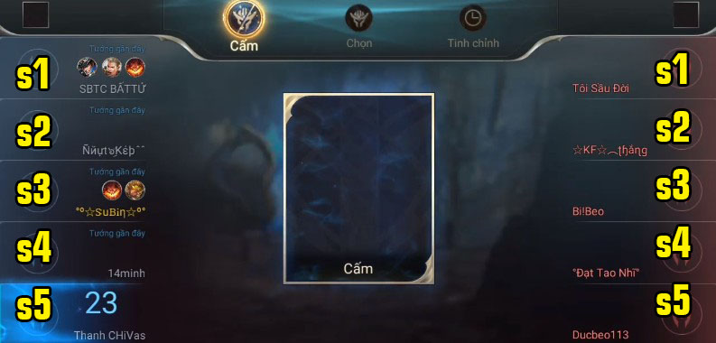 - Người chơi đứng ở vị trí s5 của mỗi bên sẽ là những người đảm nhận nhiệm vụ cấm tướng.