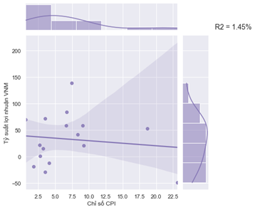 Đồ thị có độ dốc thấp với hệ số tương quan chỉ là 1,45% phản ánh diễn biến giá của cổ phiếu VNM dường như ít phụ thuộc vào lạm phát.