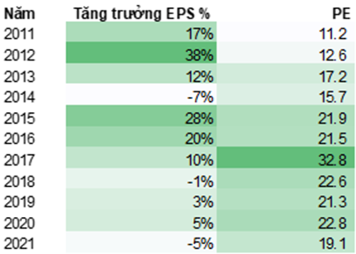 Biểu đồ nhiệt Tăng trưởng EPS và Chỉ số P/E của VNM giai đoạn 2011 – 2021