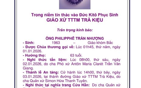 THÔNG BÁO: THÁNH LỄ TẠ ƠN MỪNG KỶ NIỆM 63 NĂM THÀNH LẬP GIÁO PHẬN (1963 – 2026); CẦU NGUYỆN CHO ĐỨC CỐ GIÁM MỤC TIÊN KHỞI PHÊRÔ MARIA PHẠM NGỌC CHI VÀ TRUYỀN CHỨC PHÓ TẾ TẠI GIÁO XỨ TTTM TRÀ KIỆU