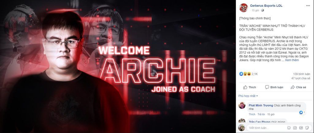 Cách đây ít giờ, trên Fanpage chính thức của Cerberus Esports LOL đã chính thức xác nhận việc tuyển thủ huyền thoại Trần “Archie” Minh Nhựt sẽ chính thức trở thành huấn luận viên trưởng của đội tại mùa giải 2020. Đây quả là một tin tức vô cùng bất ngờ đối với cộng đồng Liên Minh Huyền Thoại nước nhà khi trước đó không hề có một tin tức nào được hé lộ giữa mối quan hệ của cả hai.