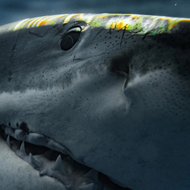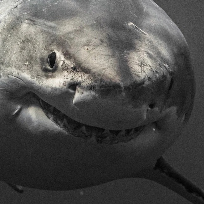 Một trong những bức ảnh chụp được con cá mập trắng với đôi mắt đen cùng một hàm răng đang nhe ra dưới nước, chỉ cách ống kính máy ảnh vài inch. Những chiếc răng của nó thực sự trông sắc lẹm như dao cạo.