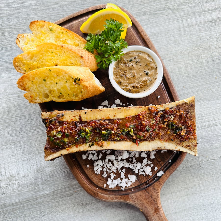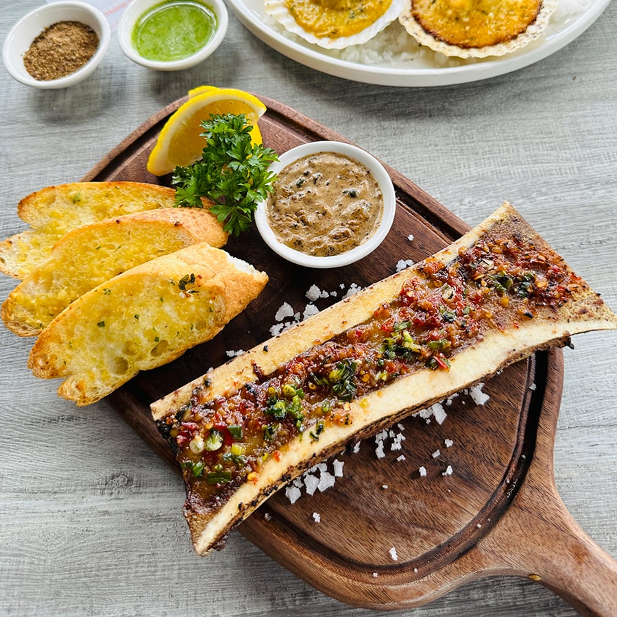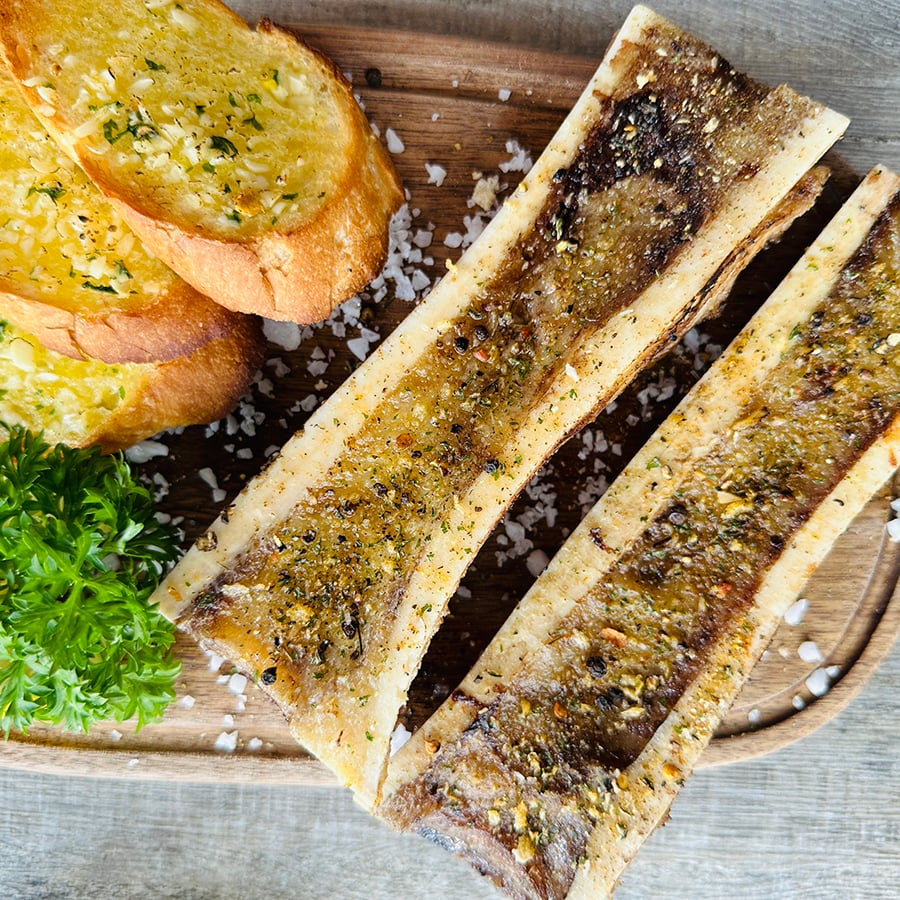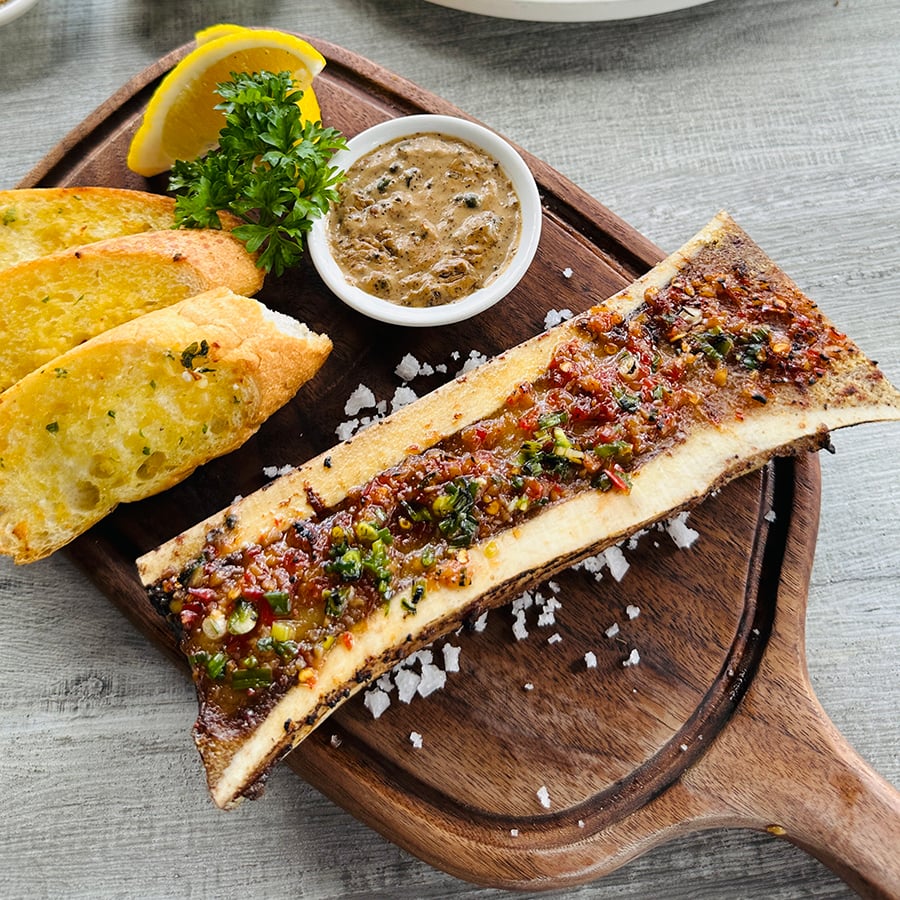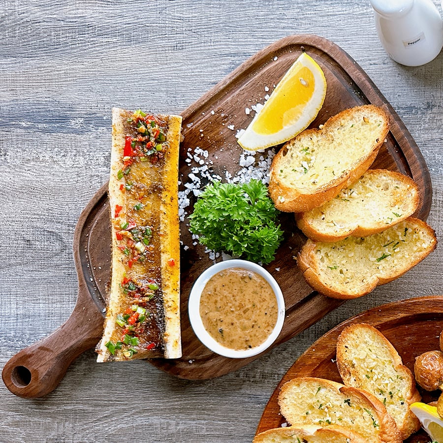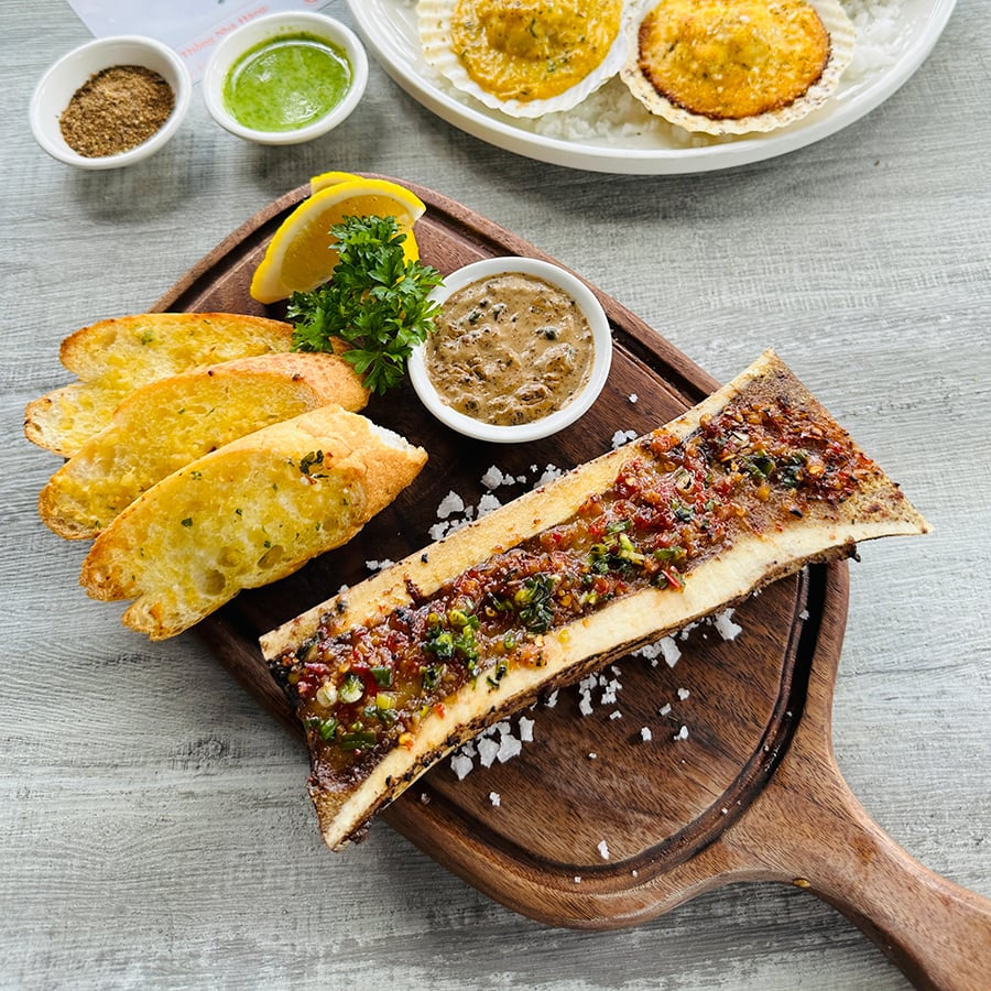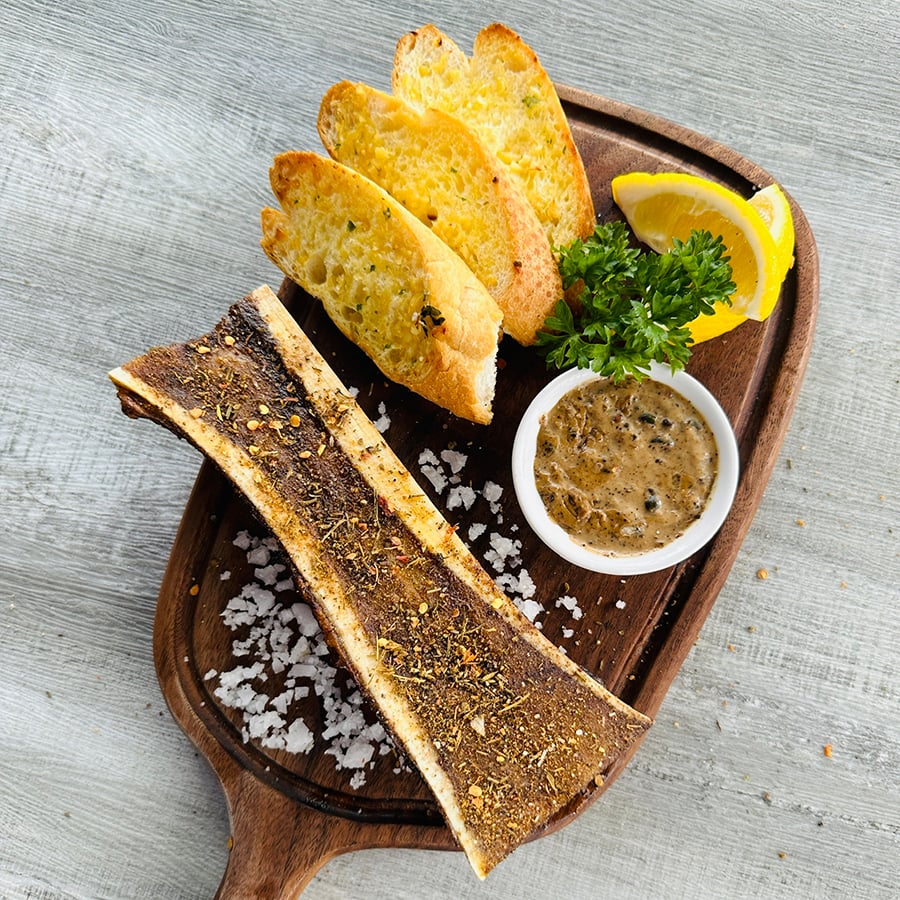 1/2 xương ống tủy bò cắt dọc + 3 lát bánh mì nướng + sốt tiêu. Thưởng thức từng miếng tuỷ xương bò chín béo ngậy, tan mềm trên đầu lưỡi cùng sốt tiêu thơm phức.169,000₫ / Cây