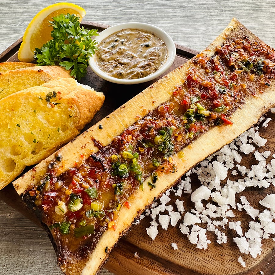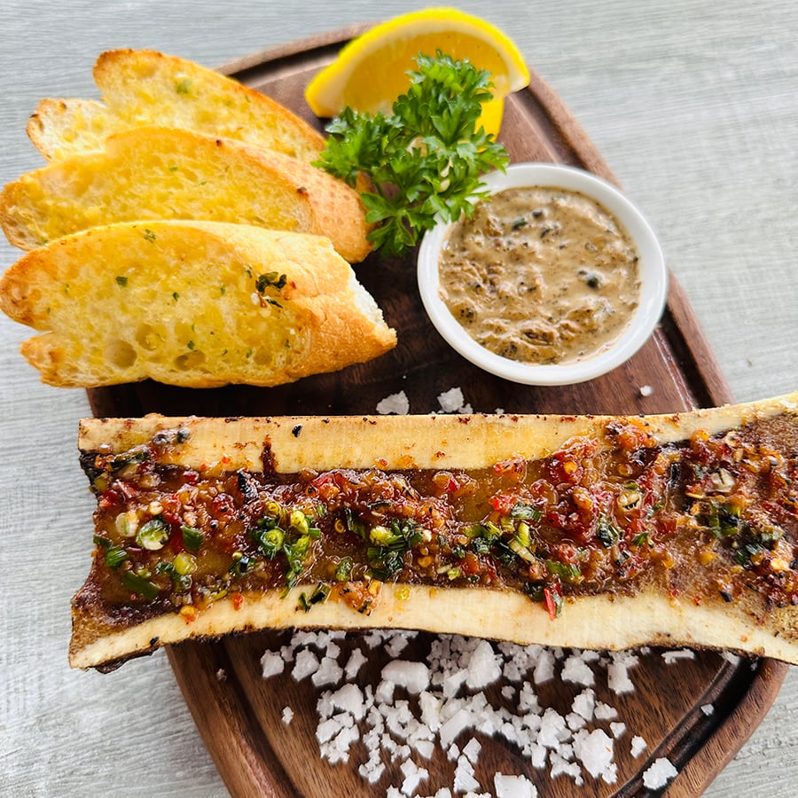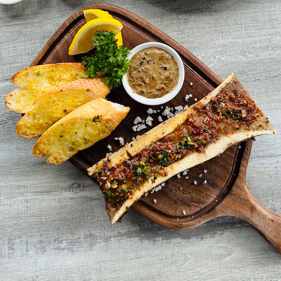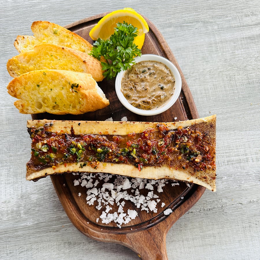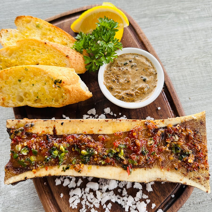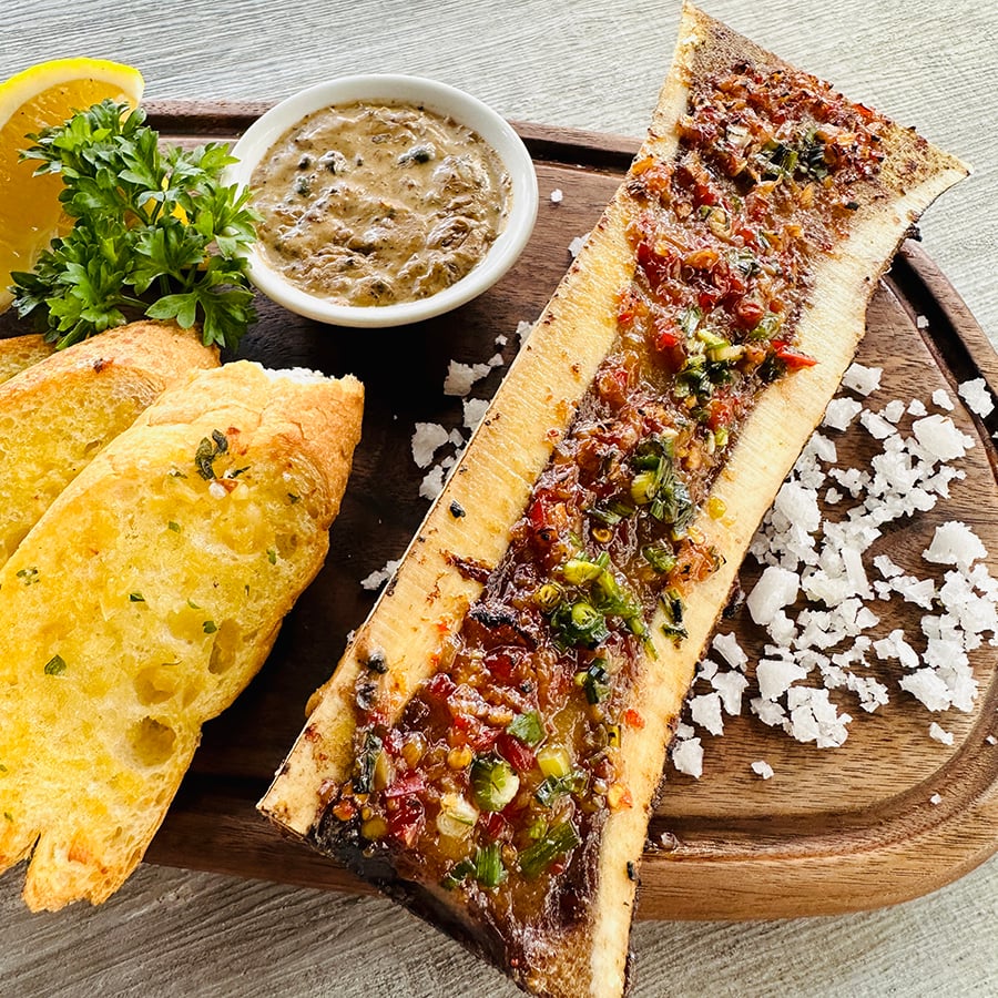 1/2 xương ống tủy bò cắt dọc + 3 lát bánh mì nướng + sốt tiêu. Thưởng thức từng miếng tuỷ xương bò chín béo ngậy, tan mềm trên đầu lưỡi cùng sốt tiêu thơm phức.169,000₫ / Cây
