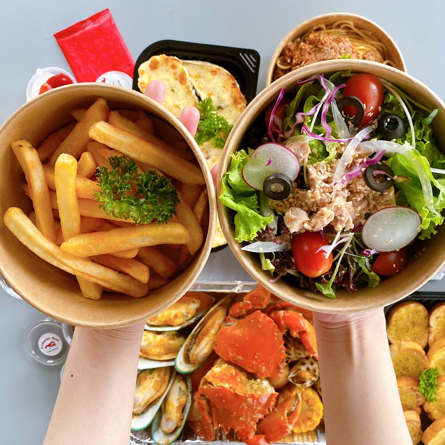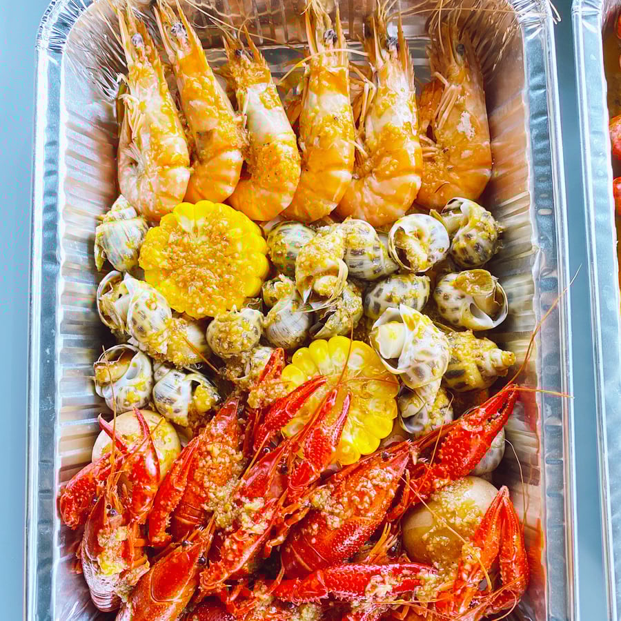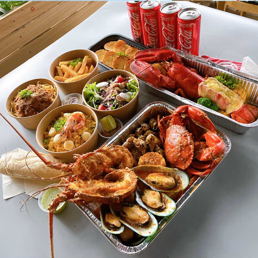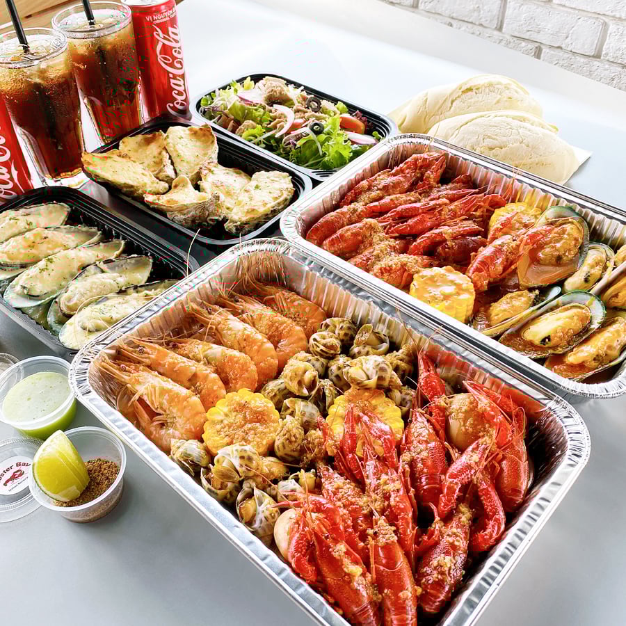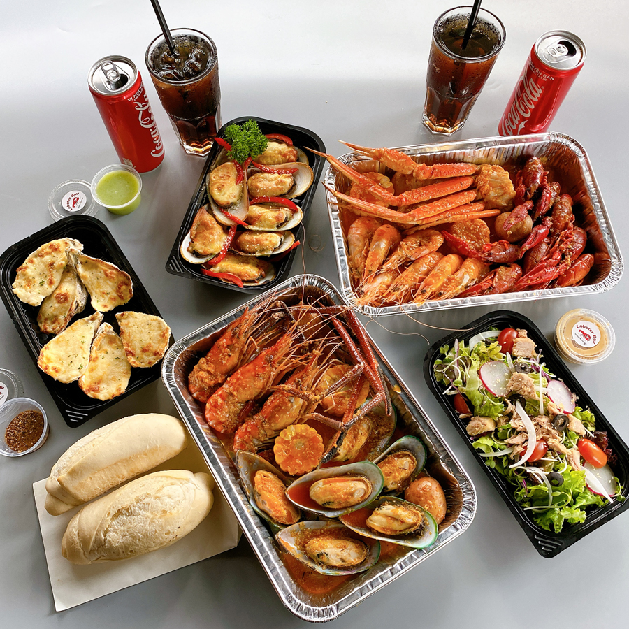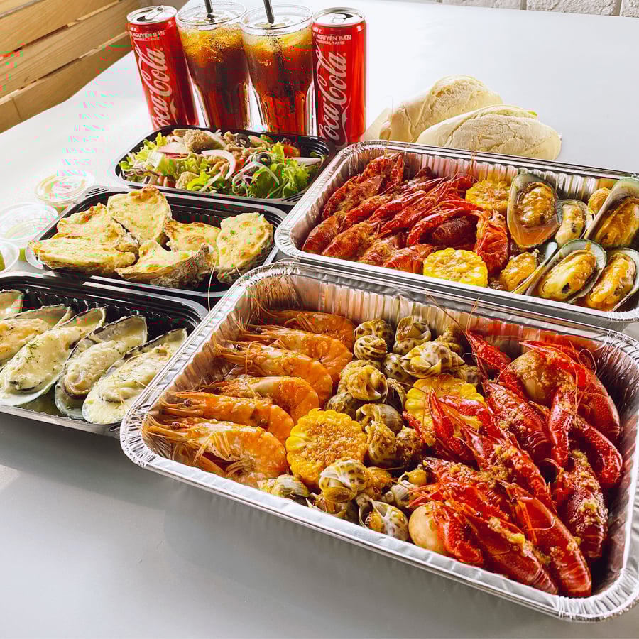 - 3 Phần Salad Cá Ngừ - 4 Phần Tôm Chiên Xù - 3 Hàu Nướng Phô Mai/ Bơ Tỏi/ X.O - 3 Combo 1 Crawfish & Vẹm sốt Cajun/ Bơ Tỏi/Tứ Xuyên/Thái Chanh Sả/Ớt Singapore + Khoai, Bắp & Bánh mì tươi - 2 Combo 4 Ốc Hương sốt Cajun/ Bơ Tỏi/Tứ Xuyên/Thái Chanh Sả/Ớt Singapore + Khoai, Bắp & Bánh mì tươi - 15 Bánh Mì Tươi - 3 Cơm Chiên Sò Điệp - 3 Miến Mực Sốt Xí Muội - 3 Mì Ý Bò Bằm - 8 Coca - 7 Tiger Nâu3,900,000₫ / Phần 4,665,000₫