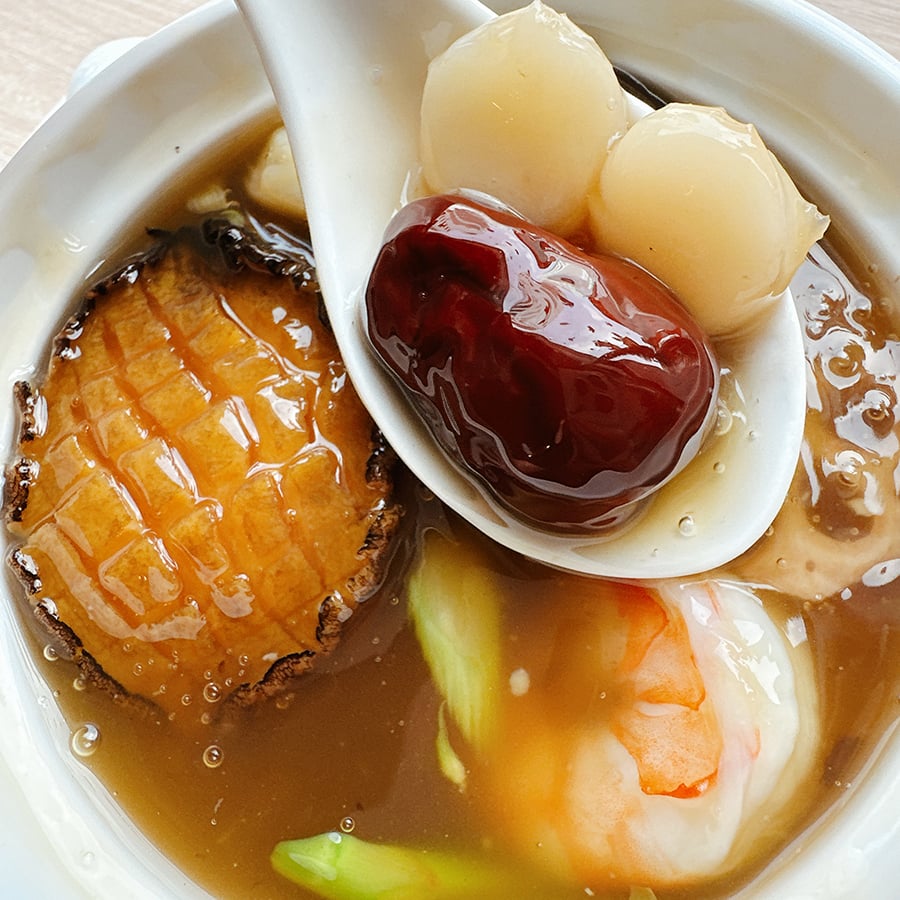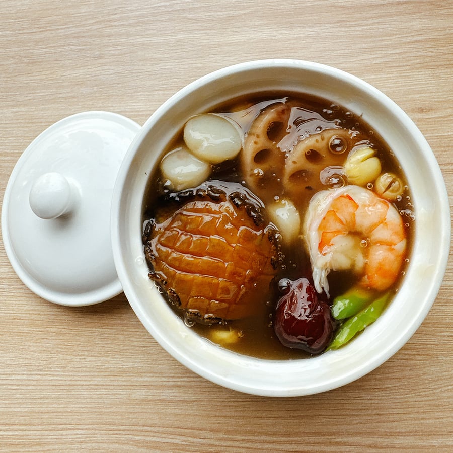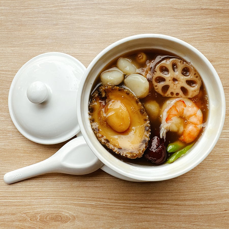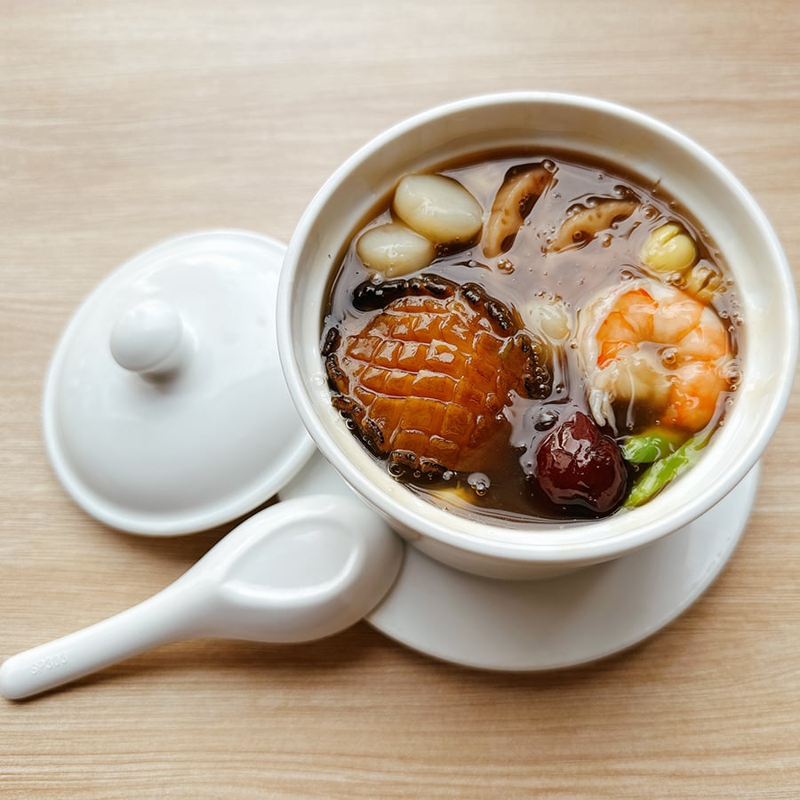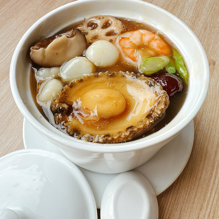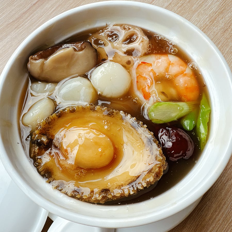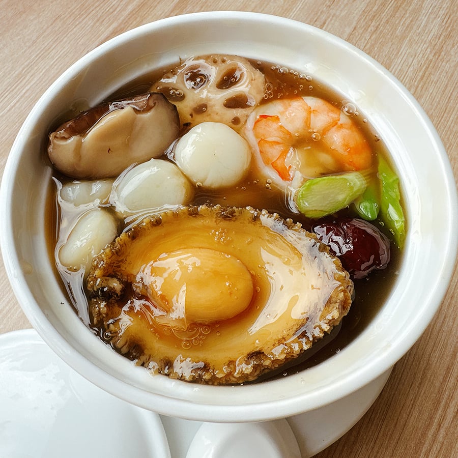 Thành Phần Gồm: 1 con Bào Ngư, 2 con tôm sú, 50g cồi điệp nhỏ, táo đỏ, củ sen, hạt sen, nấm đông cô, măng tây. Mang đến quý thực khách món súp Bào Ngư thơm mềm, nước súp ngọt thanh vị tự nhiên, quý khách cảm nhận được hương vị tươi ngon nguyên bản giàu dưỡng chất của món súp Bào Ngư thượng hạng.169,000₫ / Phần 189,000₫