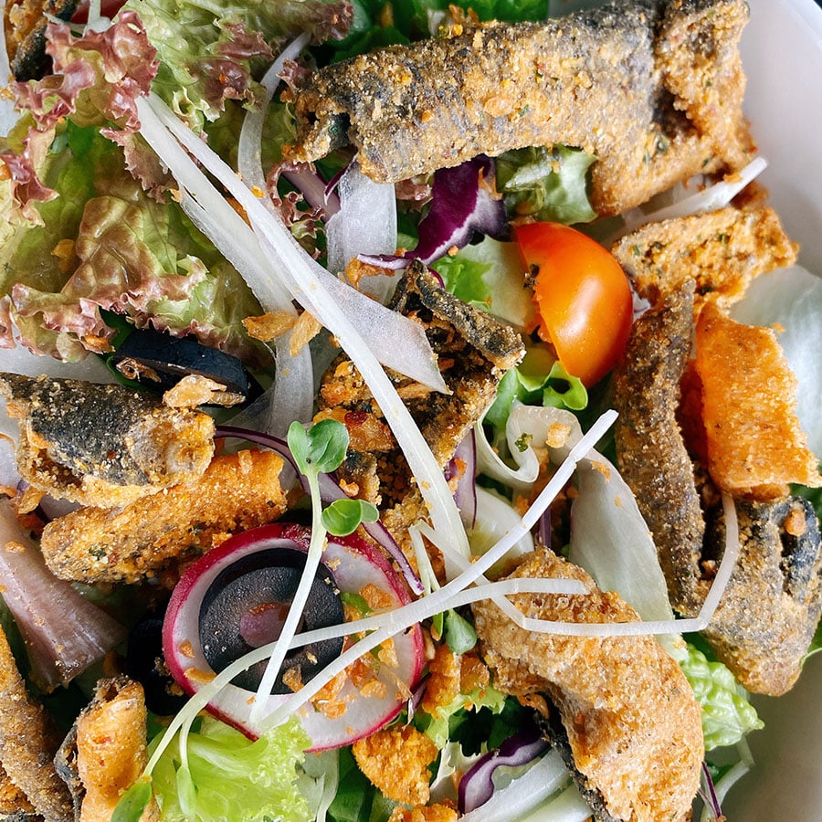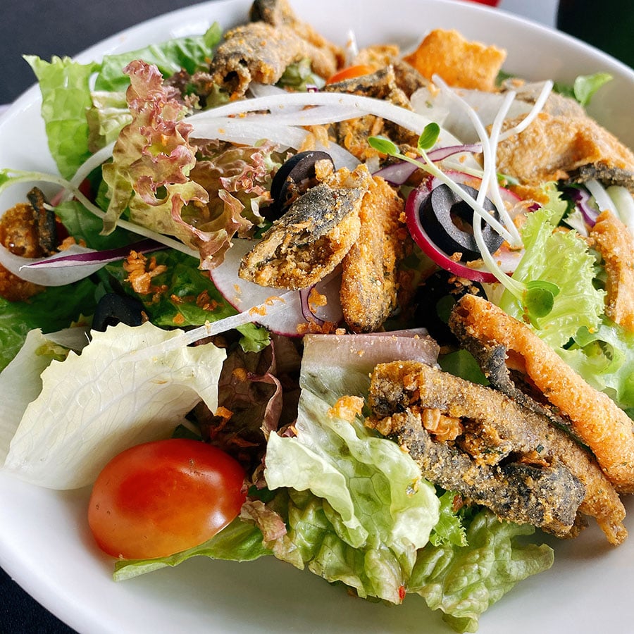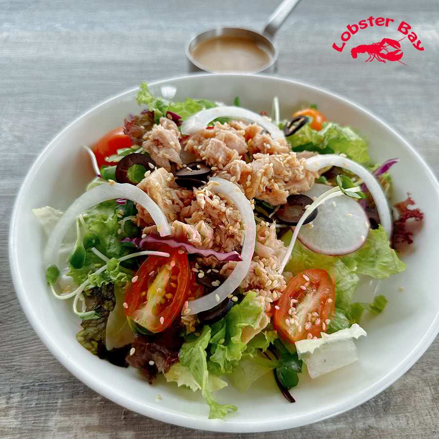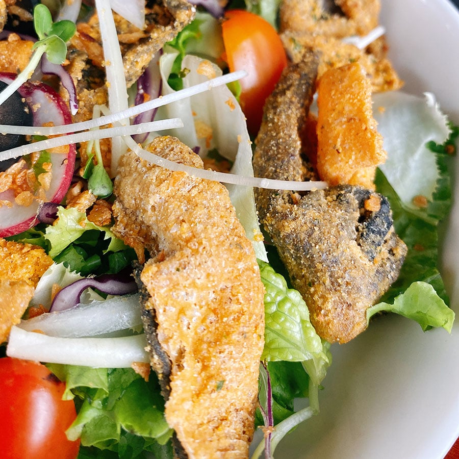 Salad da cá hồi gồm rau củ tươi xanh, giòn mát, cà chua bi mọng nước, oliu bổ dưỡng, hòa quyện cùng da cá hồi chiên giòn, dùng kèm sốt cocktail hấp dẫn. Thưởng thức salad da cá hồi cùng các món ăn khác làm cho món ăn ngon miệng và hấp dẫn hơn.85,000₫ / Phần