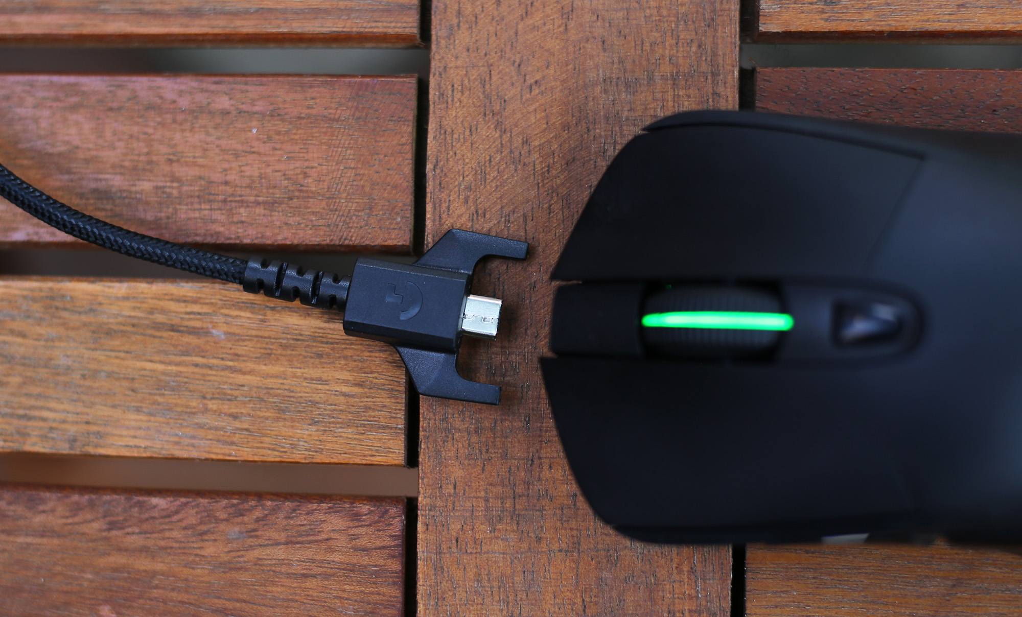 Cụ thể chúng ta có thể thấy rằng bộ nhận sóng có thể gắn ở ngay đầu dây sạc và đến khi chuột hết pin, hoặc gần hết với đèn LED đỏ nháy ở nút cuộn thì game thủ dễ dàng 'ngắt cả cụm' ra rồi cắm vào cổng micro USB phía trước để chuyển sang chế độ vừa sạc vừa dùng dây. Tất cả thao tác chỉ diễn ra trong vài giây đồng hồ, không bao giờ ảnh hưởng tới màn chơi cả.