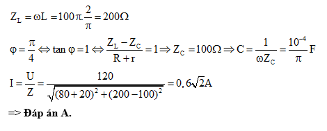 cos100πt (V). Điện dung C nhận giá trị nào sau đây thì cường độ dòng điện chậm pha hơn u một góc 450? Cường độ dòng điện khi đó bao nhiêu?