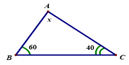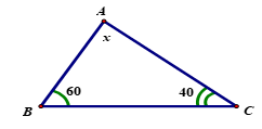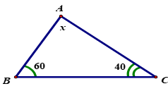 \(\begin{align} & \Rightarrow \widehat{A}=180{}^\circ -\left( \widehat{B}+\widehat{C} \right)={{180}^{0}}-\left( {{60}^{0}}+{{40}^{0}} \right) \\ & \Rightarrow \widehat{A}={{80}^{0}}. \\ \end{align}\)