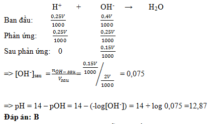 Nhận biếtTrộn lẫn V ml dung dịch NaOH 0,4M với V ml dung dịch HCl 0,25M được 2V ml dung dịch Y. Dung dịch Y có pH là:
